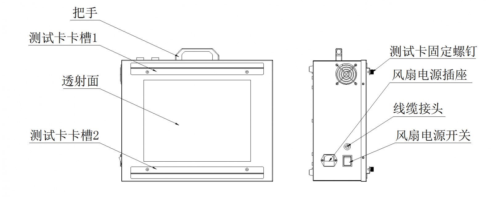 T259000+高照度/可調色溫透射燈箱主要由:箱體(ti) 、把手、測試卡槽、透射麵板、光源開關(guan) 、測試卡固定螺釘、電源插座、電源開關(guan) 、光源控製盒等部件組成。